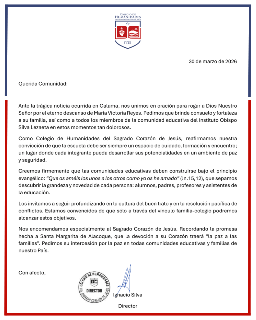 Carta del director a nuestra comunidad educativa. Hoy queremos detenernos y unirnos en oración. Creemos firmemente que las comunidades educativas deben construirse bajo el principio evangélico: “Que os améis los unos a los otros como yo os he amado”(Jn.15,12) Encomendamos