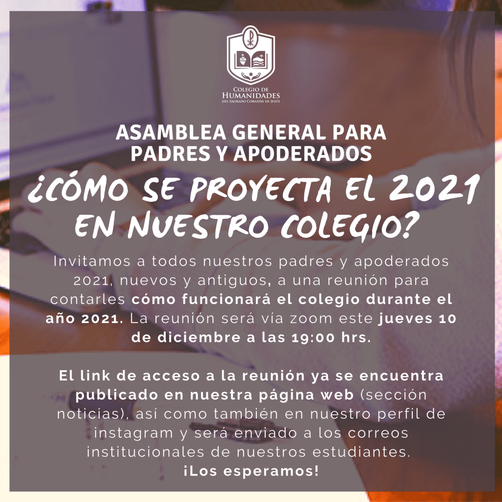 Invitamos a todos nuestros padres y apoderados 2021, nuevos y antiguos, a una reunión para contarles cómo funcionará el colegio durante el año 2021. La reunión será vía zoom este jueves 10 de diciembre a las 19:00 hrs. El link Leer más…