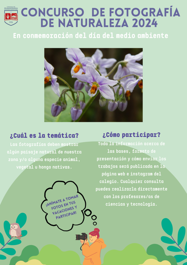 El departamento de Ciencias y tecnología del Colegio de Humanidades del Sagrado Corazón de Jesús llama a la comunidad escolar a celebrar el Día Mundial del medio ambiente. Con este fin se invita a todos los estudiantes, de sede centro, a participar en un concurso fotográfico que retrate la biodiversidad presente en nuestra zona, a través de fotografías de paisajes y especies vegetales, animales u hongos.