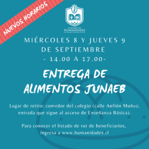 Estimadas familias: El Miércoles 08 y Jueves 9 de Septiembre ,desde las 14:00 a las 17:00 hrs, estaremos entregando los alimentos JUNAEB en el comedor del colegio...
