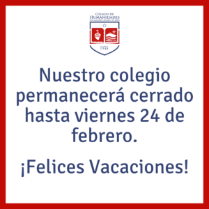 Estimada comunidad CDH: informamos que nuestro colegio permanecerá cerrado hasta el día viernes 24 de febrero. Esperamos que tengan unas felices y descansadas vacaciones...