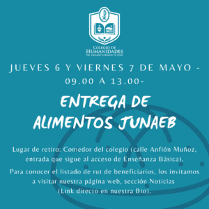 Estimadas familias: El Jueves 06 y Viernes 07 de Mayo , desde las 09:00 a las 13:00 hrs, estaremos entregando los alimentos JUNAEB en el comedor del colegio, calle Anfión Muñoz, entrada que sigue al acceso de Enseñanza Básica. Las