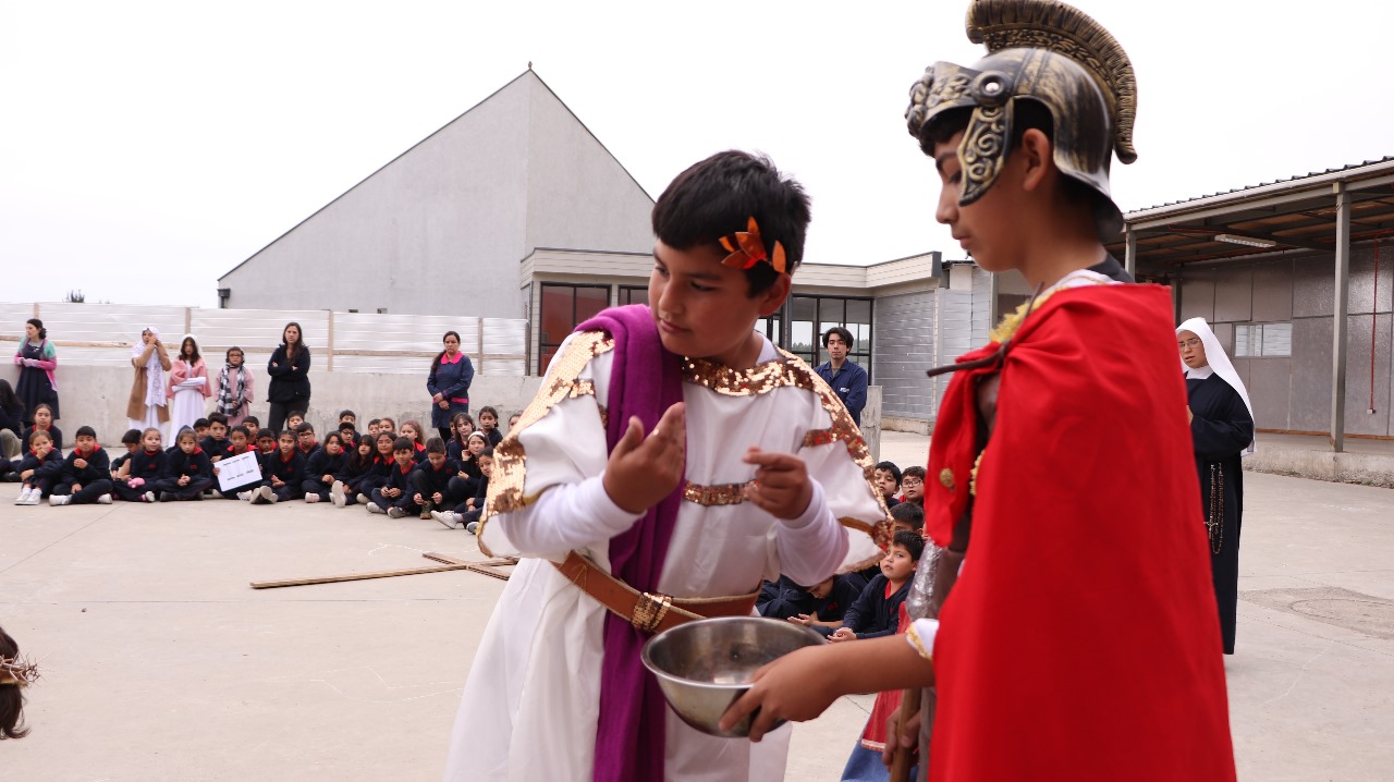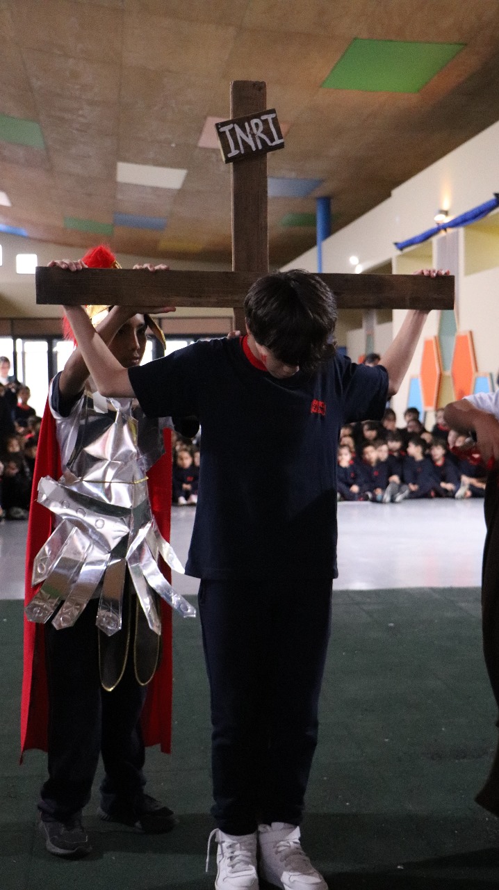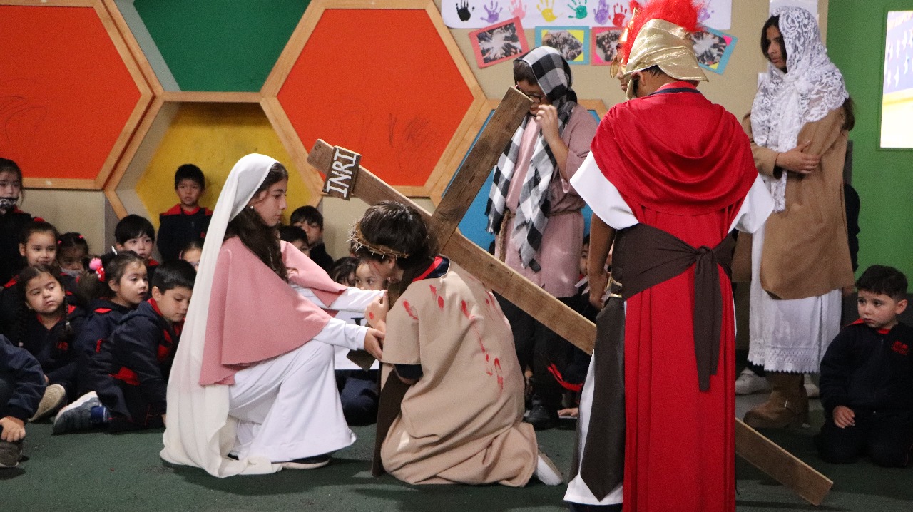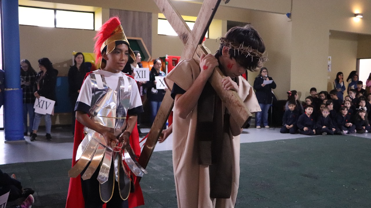 el miércoles 27 de marzo, en el marco de la Semana Santa, los estudiantes de sexto básico representaron el Vía Crucis a sus compañeros de primer y segundo ciclo.