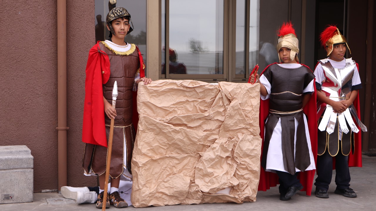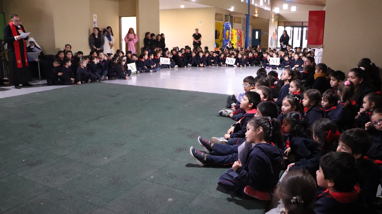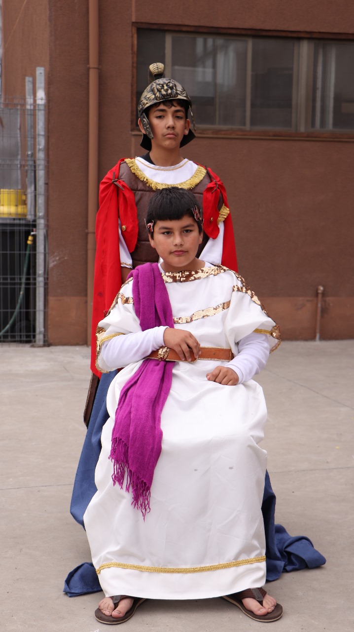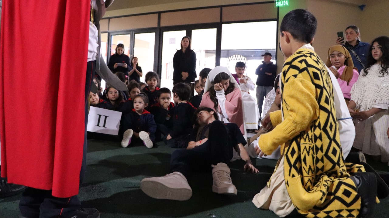 el miércoles 27 de marzo, en el marco de la Semana Santa, los estudiantes de sexto básico representaron el Vía Crucis a sus compañeros de primer y segundo ciclo.