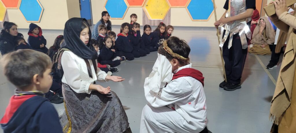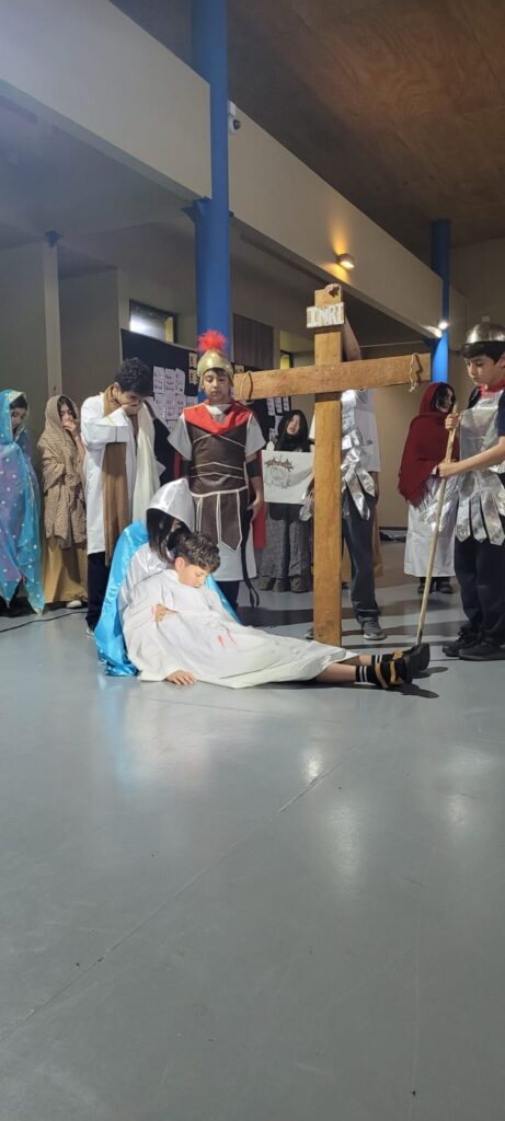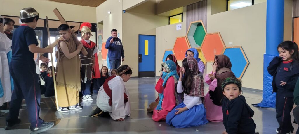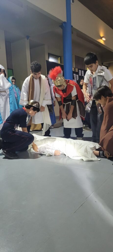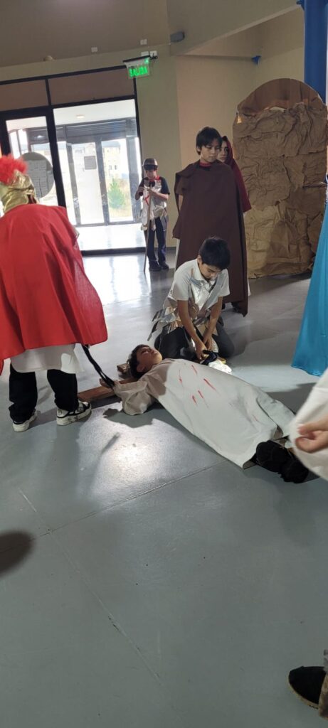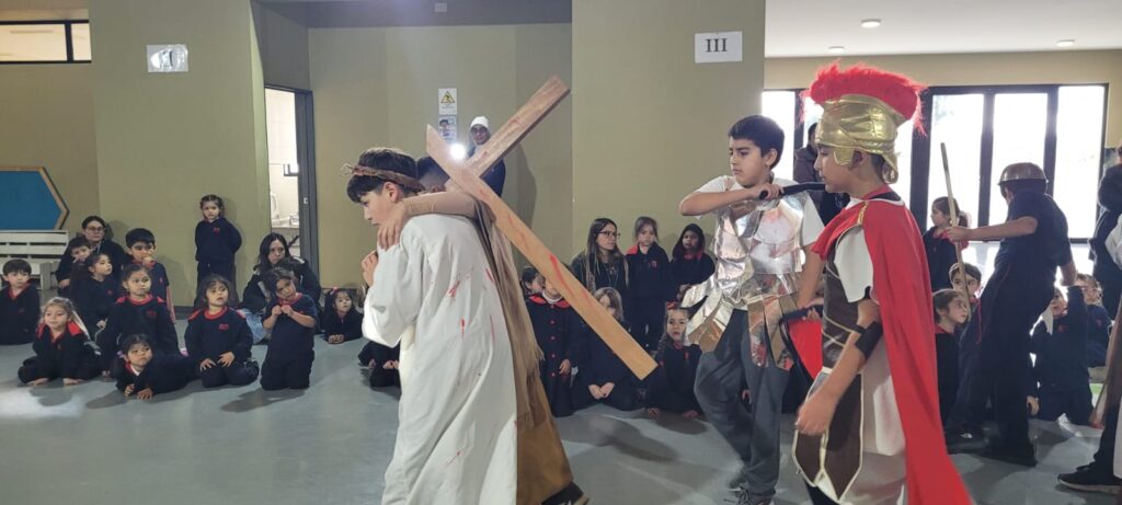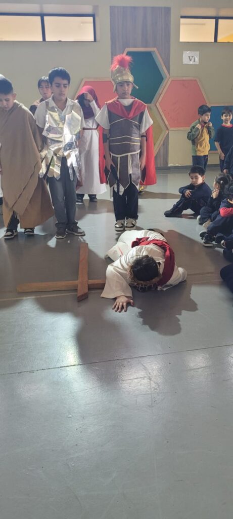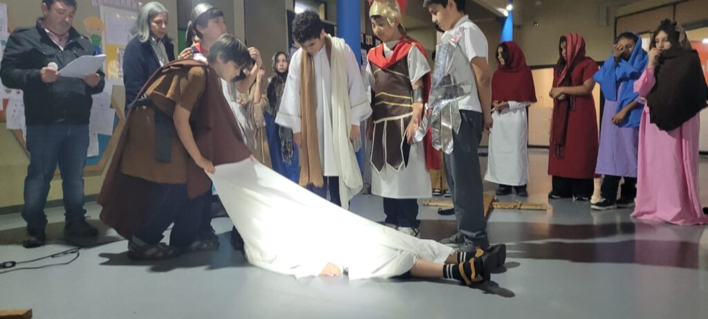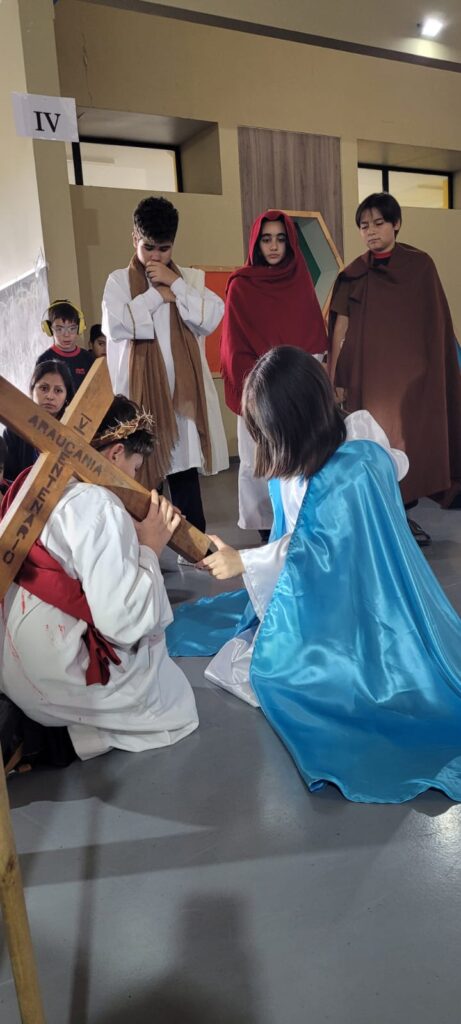 Los alumnos fueron los protagonistas de esta significativa puesta en escena, recreando con respeto y compromiso cada una de las estaciones que narran el camino de Jesús hacia la cruz. A través de sus actuaciones, pudimos contemplar el calvario de Cristo y reflexionar sobre su entrega y amor incondicional por la humanidad.